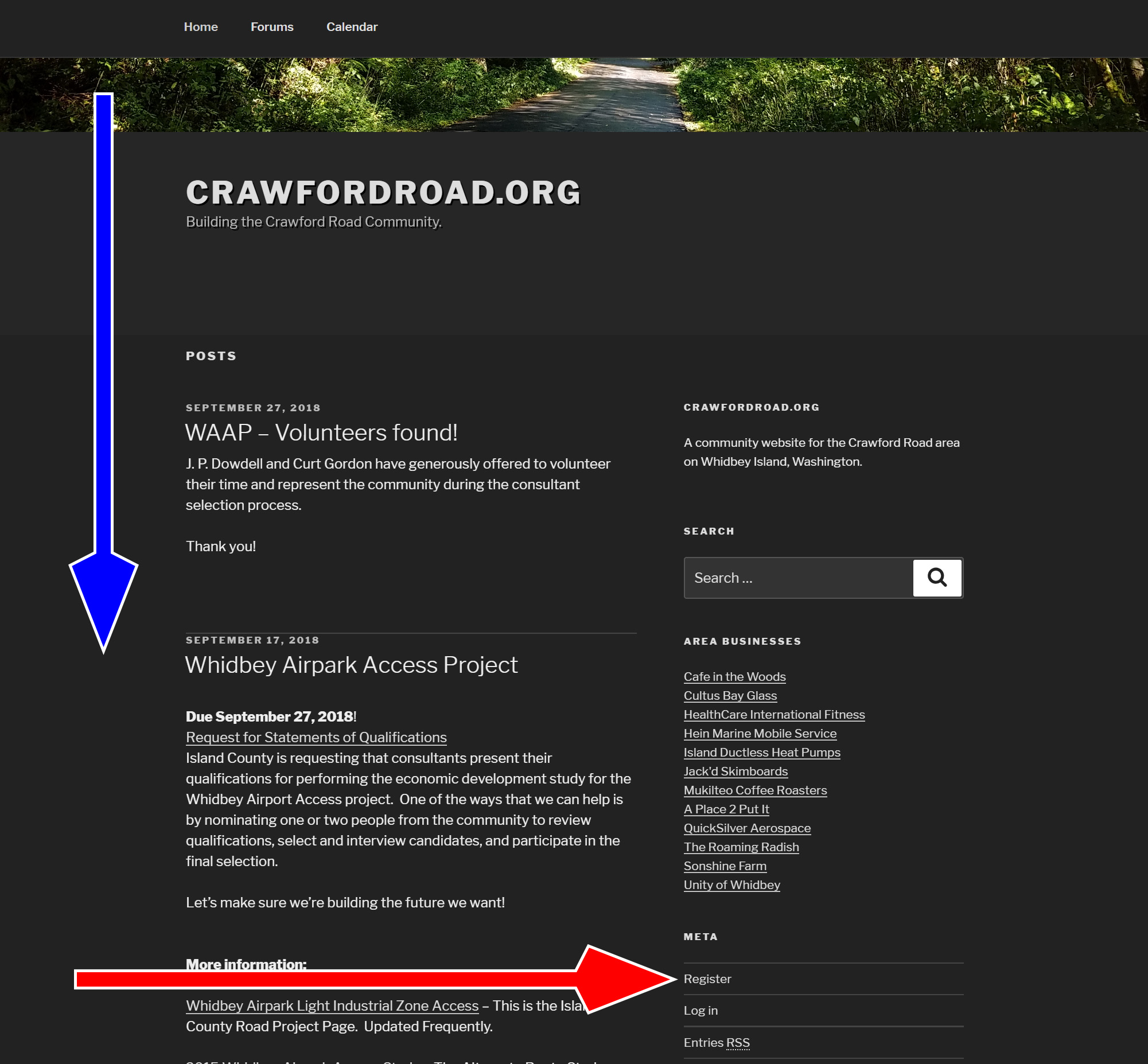 1. Scroll down in the page (blue arrow) and click “Register” (red arrow)