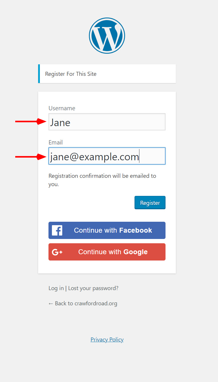 2.  Enter the username you’d prefer to use, and your email address in the form, then click “Register”.  If you have a Facebook or Google account, you can use them to login, if you’d prefer to do that.